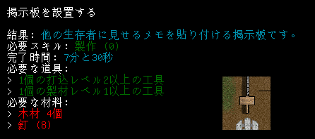 最後に建設コマンドを確認しよう。農園に張り巡らされていた白い柵は上の画像かな?避難センターに設置するのは簡単だろう。木材は森から回収できる。釘は拠点に置いてある物を持って行きます。