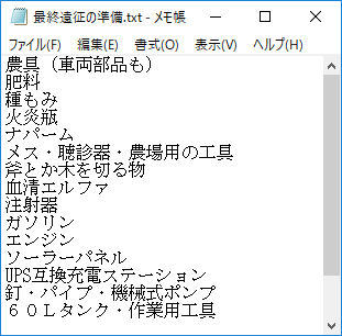 必要だと思ったアイテムは忘れないうちにメモをしておこうか。今回のプレイ日記はここで中断しよう。次回は『血清(エルファ)』のために卵を探します。延々と平野を走行しまくる覚悟です。