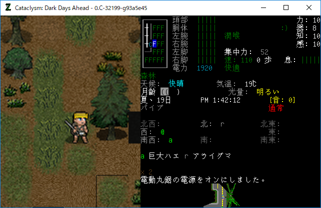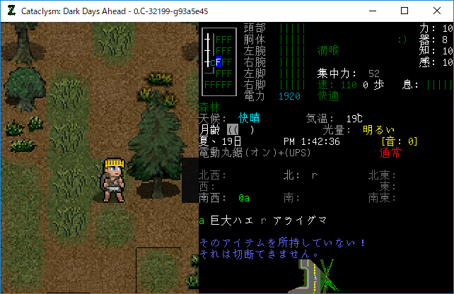 電動丸鋸を武器として装備してみよう。『s』コマンドでぶっ叩いてみたがマツの木はビクともしません。やべえぞこれ。電動丸鋸は別の用途に使う機材なのかもしれない。