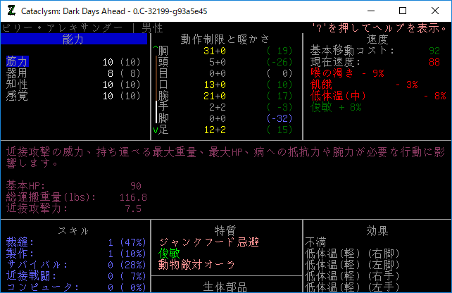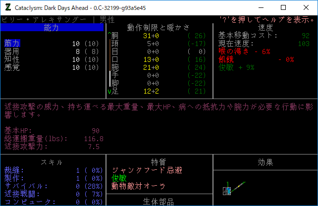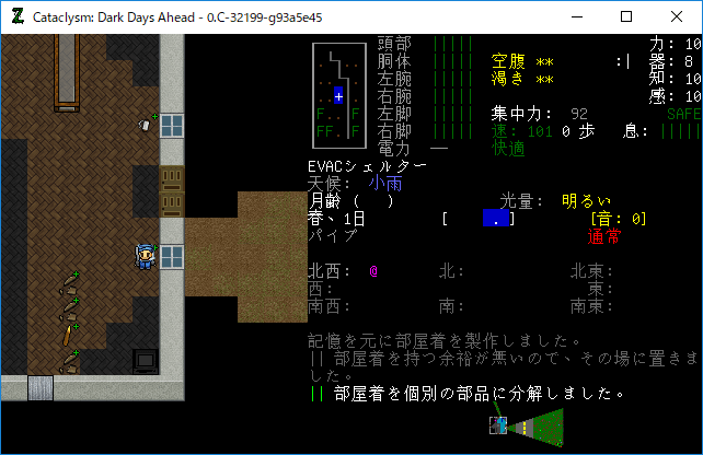 Cataclysmのプレイ日記を始めます。裁縫レベルを1に上げました。私は知識が無いから初歩的なことをダラダラと書きます。非常に読みにくいと思う。申し訳ありません。