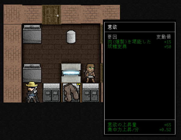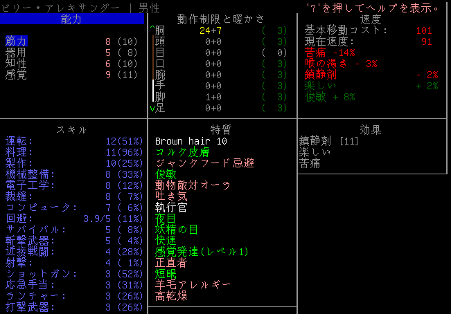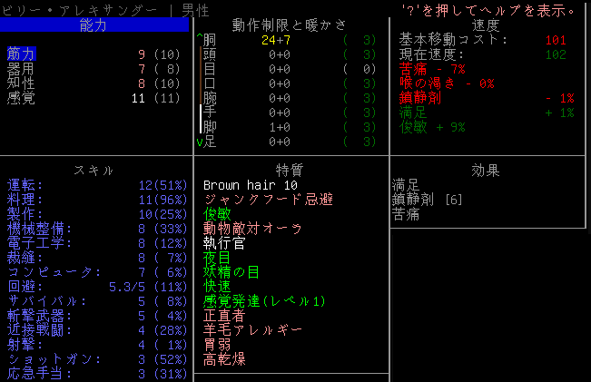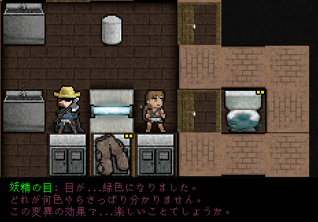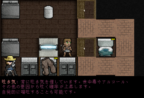 今度は・・・肌の色が変わってしまった!キャラメイクの時につけた『胃弱』の特質が『吐き気』に変化しています。『吐き気』が致命的なマイナス変異だったら詰みだな。