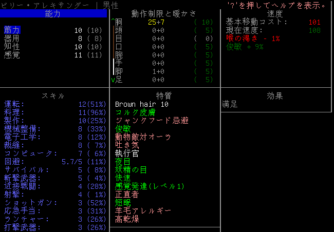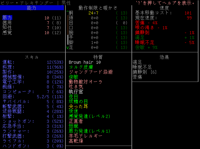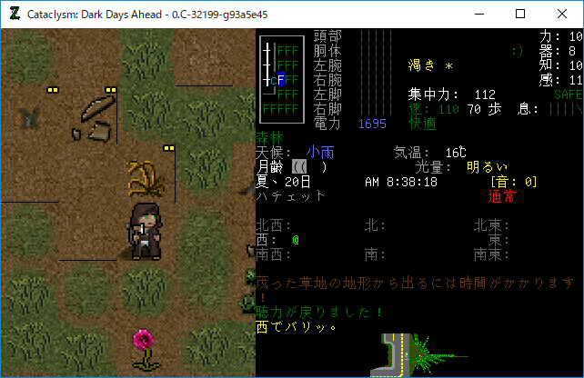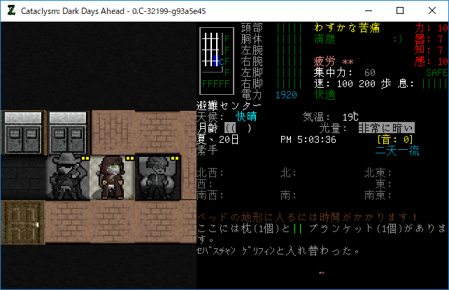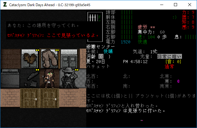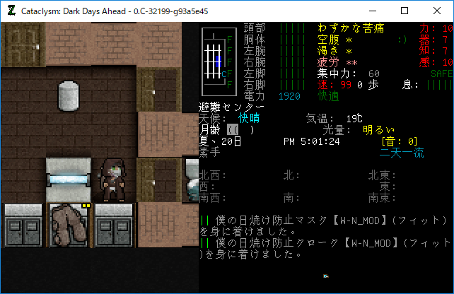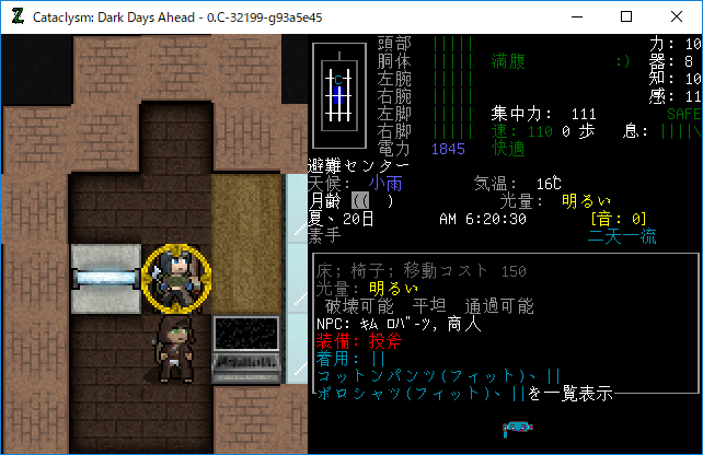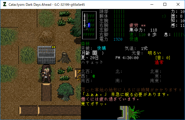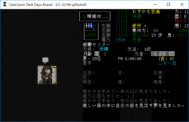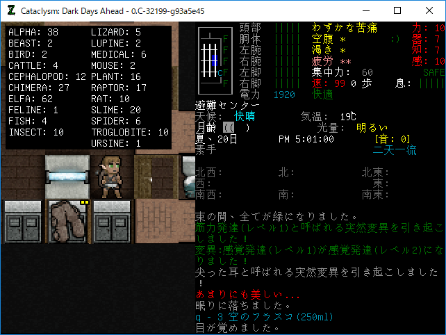 Cataclysmのプレイ日記を始めます。エルファの夢から目覚めました。副作用による苦痛は無くなったみたいだね。現在の状況を確認しよう。