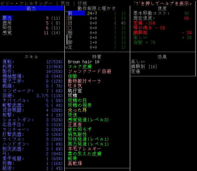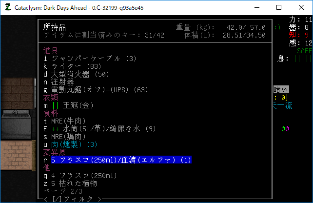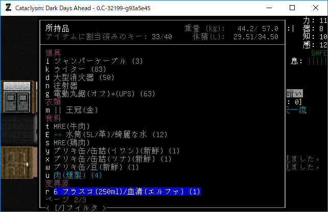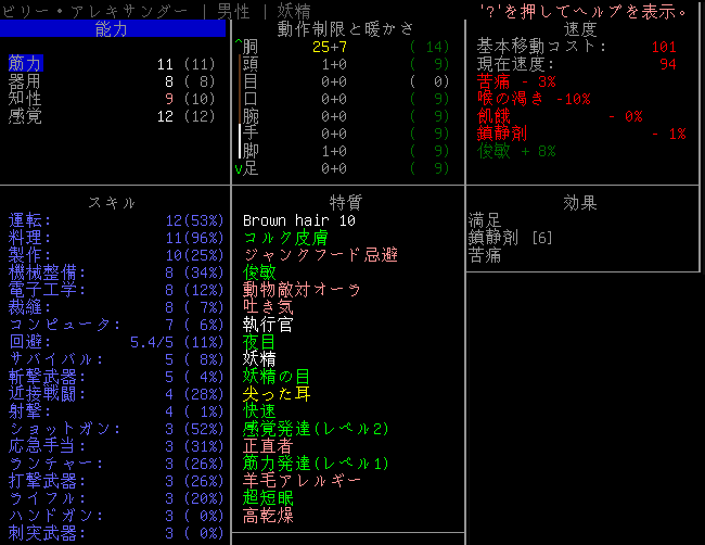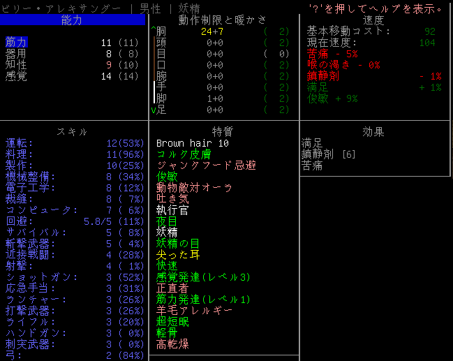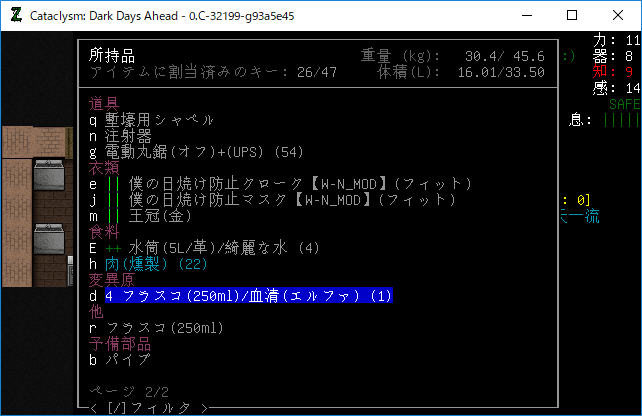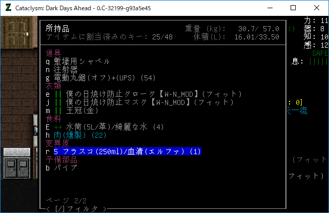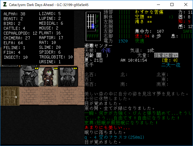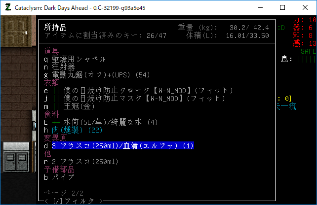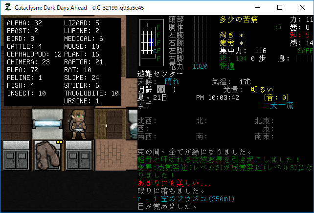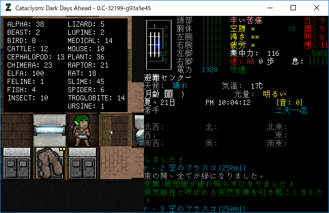 Cataclysmのプレイ日記を始めます。昨夜は3本目の血清を打ちました。おそらくはエルファの閾値を超えるのに成功したはずだ。ちょっと確認をしてみるね。