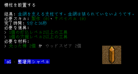 柵柱に必要な工具と素材は上の画像です。穴掘り工具は兵士ゾンビからかっぱらった『塹壕用シャベル』を使おう。材料は尖った棒かウッドスピアになります。