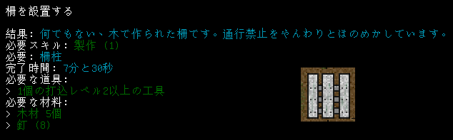 柵柱の設置はほどほどにしておこう。並べすぎると『柵門』を設置する場所が計算できなくなる。柵柱ばかり作ってもつまらないから白い柵を設置するね。