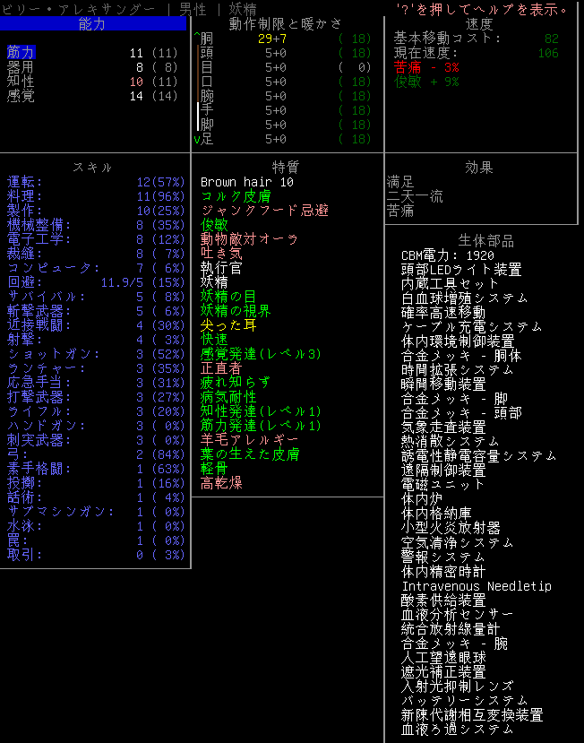 現在の能力は上の画像です。コンバットアーマーは常にオン。CBM:体内環境制御装置も常に稼働させています。電力は長棒から供給できるから助かる。もう小型火炎放射器を何十発撃ったのか思い出せません。