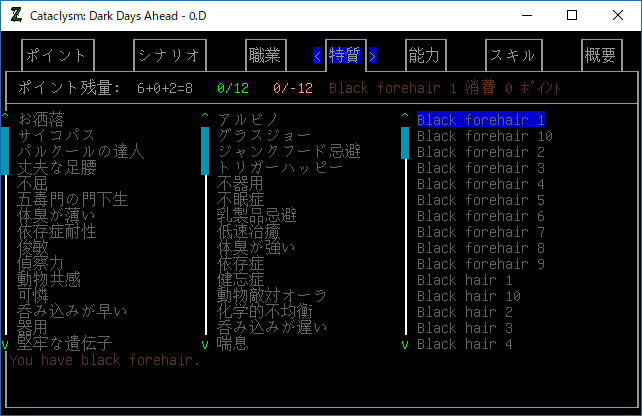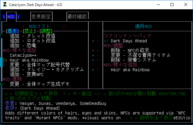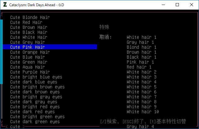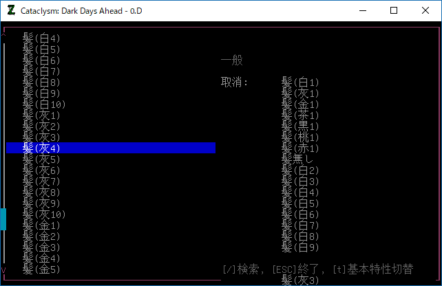 翻訳マシマシMODによりHair aka Rainbowが『追加 - 様々な髪色』に翻訳されました。安定版0.D用のzipは『cataclysmdda翻訳ファイルMOD追加版20190310.zip』になります。