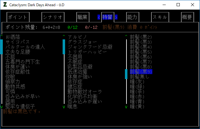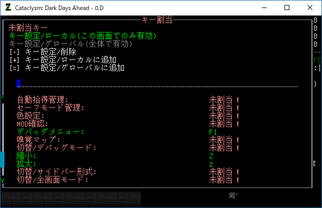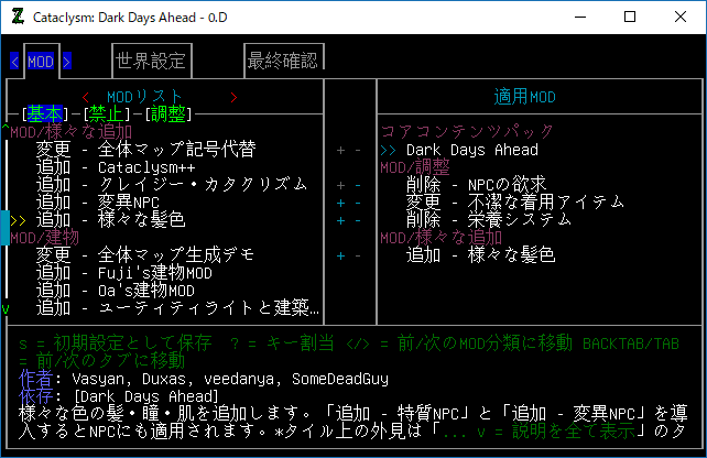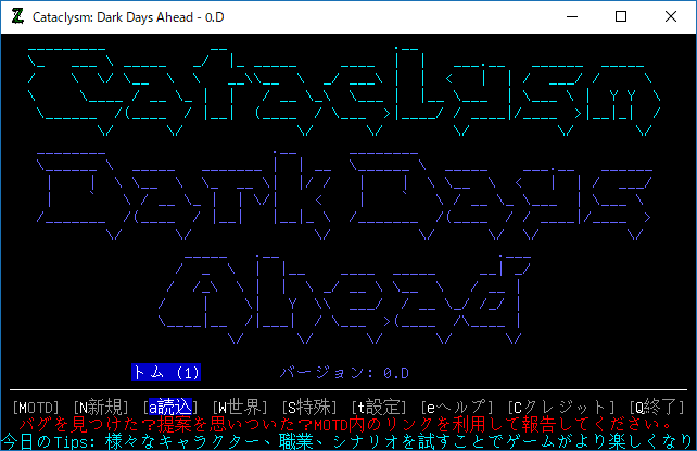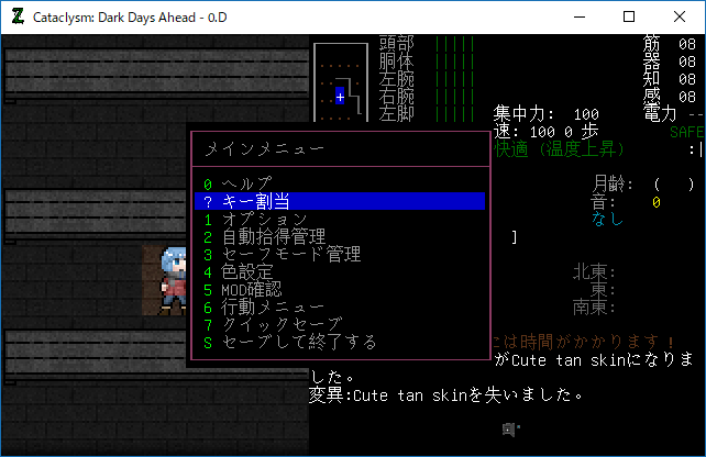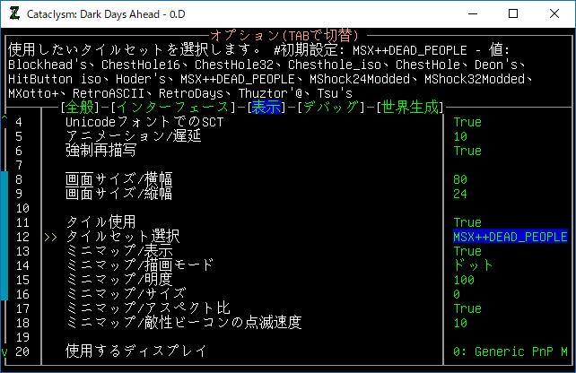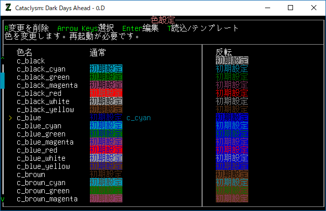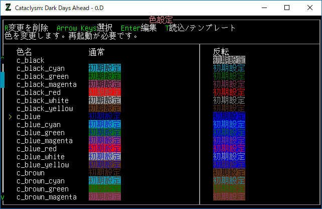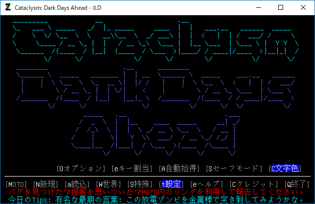 Cataclysmのプレイ日記を始めます。今回はゲームを開始する前の準備をしよう。まずは文字の色を変えようかな。