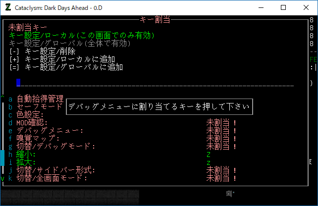 F1キーがデバッグメニューになりました。元の未割当に戻したい場合は『-』を使ってください。