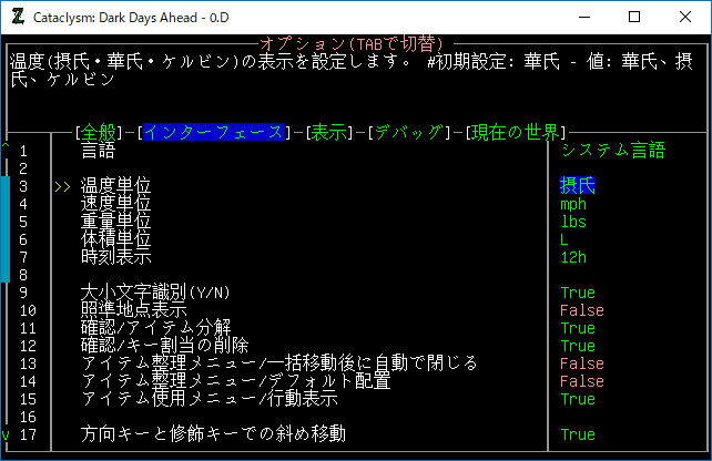 Esc→オプション→インターフェースで温度単位を変更します。見ての通り速度や時刻の単位も変更可能です。私は自家用車を作った際に速度単位も変更しています。
