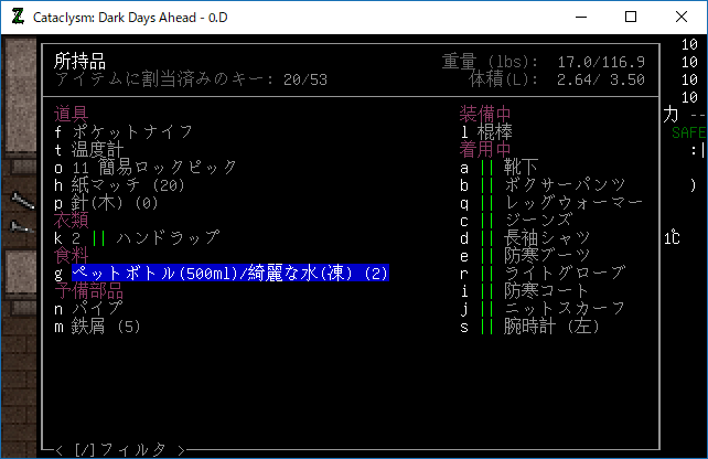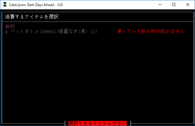 次は凍結について説明しようかな。『i』コマンドで現在のアイテムを表示することができます。食料はペットボトルに入った水だけです。しかも凍っている。