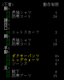 現在の防具は上の画像です。頭、口、手に何も装備をしていません。この3つの部位に防寒着を作れば外出は可能だと思う。
