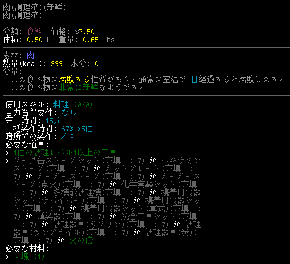 調理をすれば寄生虫に怯えなくても済みます。クラフト画面『&』にて料理をしましょう。肉塊、火の傍、調理工具さえあれば焼き肉を作れるのです。