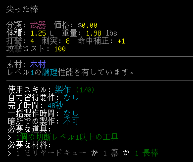 長棒は調理器具にも加工が可能です。上の尖った棒は調理レベル1のツールになる。尖った棒があれば火の傍で焼き肉を作れるわけです。