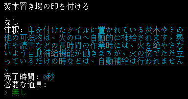 建物の中で火をつけると火事になります。しかし、火鉢やオーブンがあると安全に火を扱えるのです。火鉢を使う際は『a』コマンドで設置しましょう。