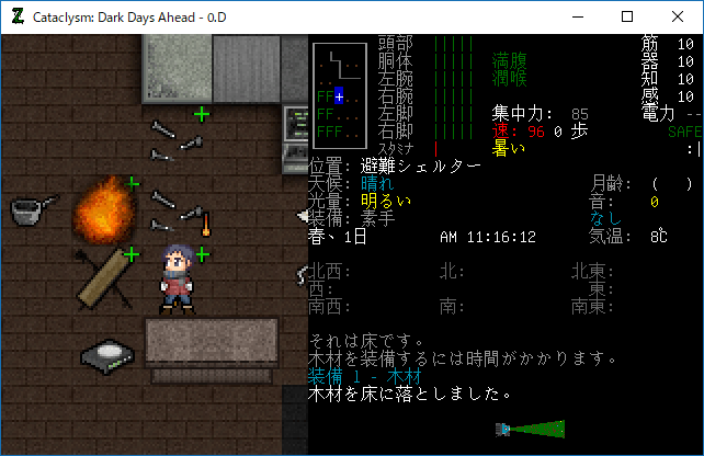 ぶっ壊した家具から木材をゲット。木材を焚木置き場に落としました。数時間は燃え続けてくれるはずだ。これで序盤の練習は終わり。次回はシナリオ学校の世界生成です。