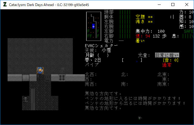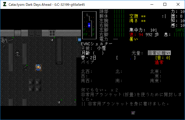 Cataclysmのプレイ日記を始めます。睡眠をとったのに辺りは真っ暗だ。まだ早朝なのかな。暗いため衣類を製作できません。下半身の装備が無いから雪の降る外へ出られない(泣)。