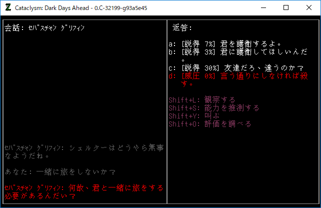 NPCの名前はセバスチャン。友好的な関係を結ぶのは難しいだろうが誘ってみます。交渉にもスキルが必要なのかな。