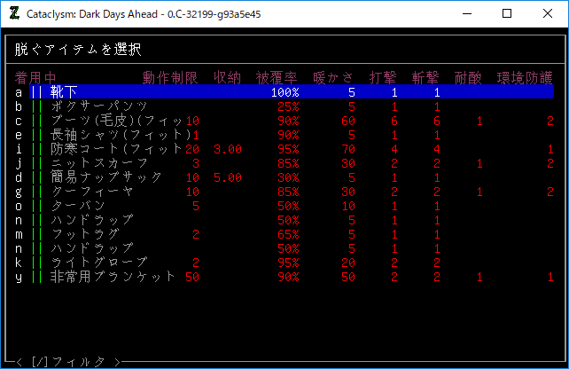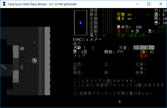 ぶっ壊したロッカーの中に非常用ブランケットが入っていました。ブランケットといえば体を暖める布だ。『a』で広げれば装備できるみたい。
