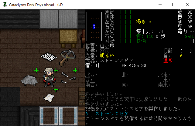 Cataclysmのプレイ日記を始めます。ストーンスピアのクラフトが完了しました。ゾンビの1体や2体は余裕で倒せそうですね。大聖堂の周辺には数十体のゾンビが出現しそうだ。情けないことに勝てる気がしません。