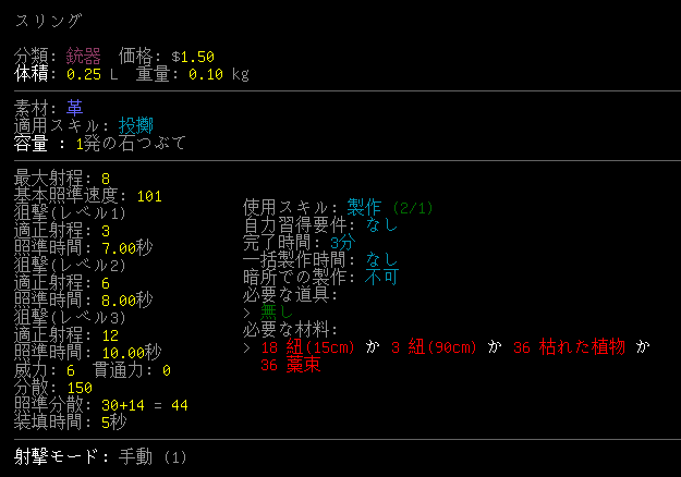 武器が槍だけでは心配です。今度は射撃武器のクラフトに取り掛かろうかな。射撃武器の候補は2つあります。片方は上の『スリング』です。狙撃レベル3の照準時間は10秒、威力は6になる。