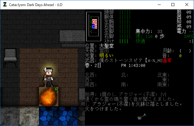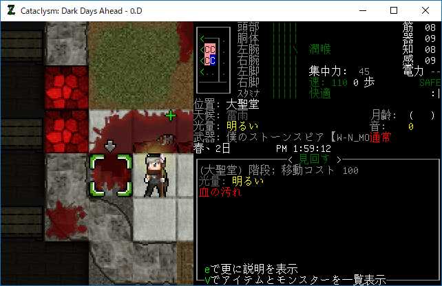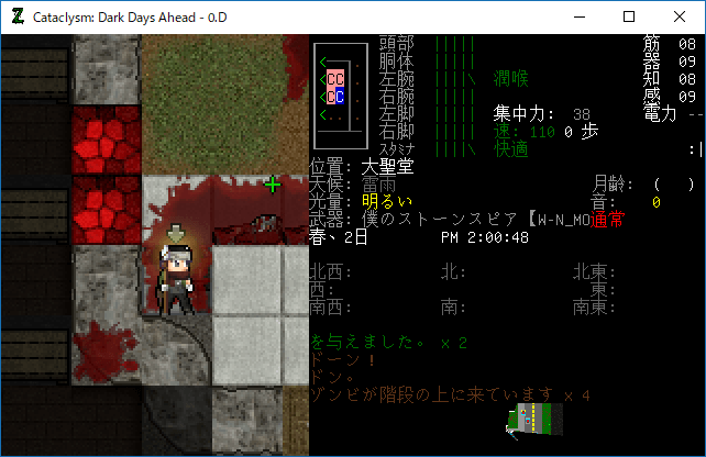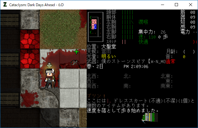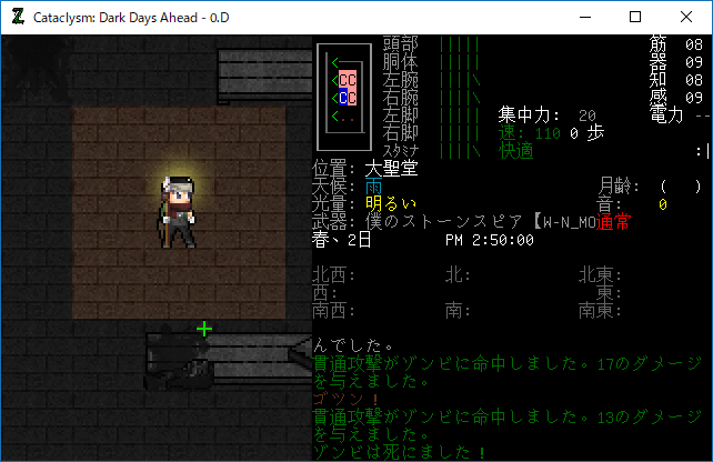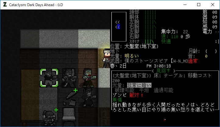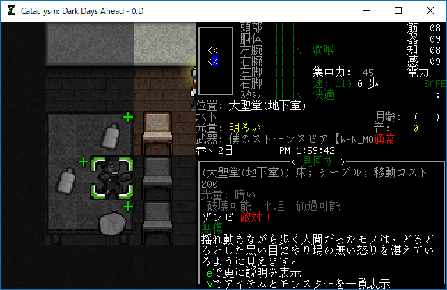 Cataclysmのプレイ日記を始めます。大聖堂の1Fを制圧しました。そんなにゾンビは多くなかったし無傷です。だが地下室での戦いは厳しいものになるだろう。