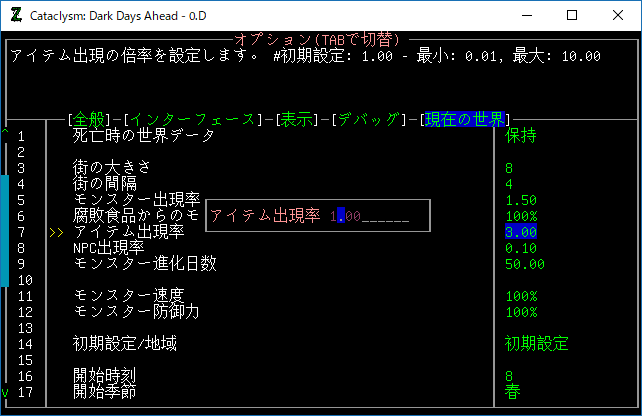 突然ですがアイテム出現率をデフォルトの『1.00』に下げます。今のままだとゾンビを倒しているだけでアイテムが揃ってしまうよ。