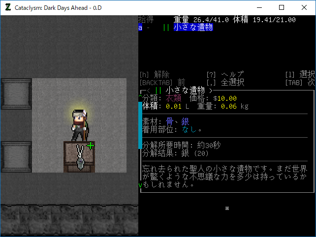 Cataclysmのプレイ日記を始めます。大聖堂の地下室をほぼ制圧しました。落ちているアイテムを確認しながら最後の部屋に向かいます。
