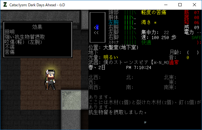 『E』コマンドで抗生物質を摂取しておこう。運良くゾンビから抗生物質をゲットしていたのです。効果に『強い抗生物質摂取』が付与されました。