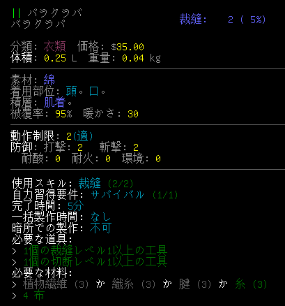 まだ寝るには早いな。裁縫スキルが2だと心細いから鍛えます。難易度2のバラクラバは製作時間が5分と短い。さらに必要な材料も少ないのでスキル上げにはうってつけだ。