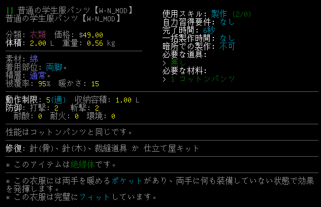 次は学生服(下)をクラフトします。性能はコットンパンツと同じです。材料もコットンパンツにしておきました。