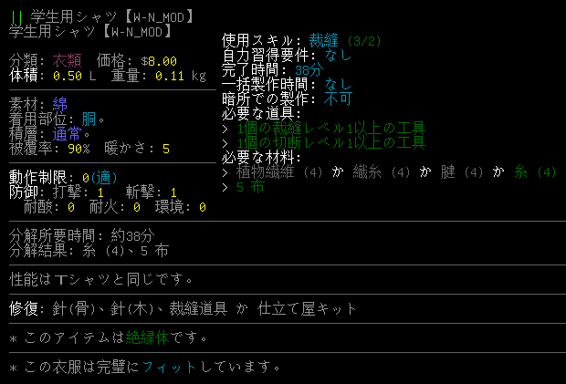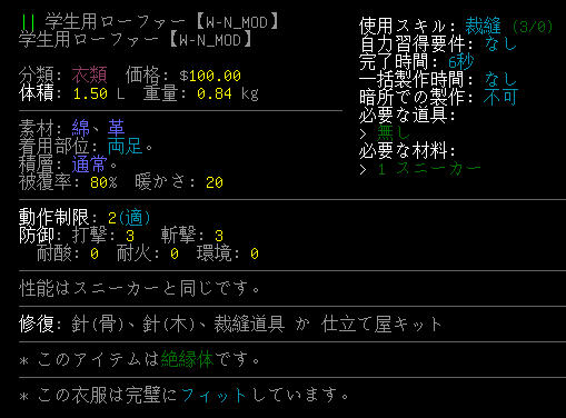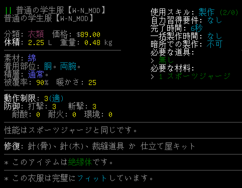 衣類の上下が学生服になったぞお。せっかくのオリジナルタイルなのに普段着と同じ性能なのは残念だ。あとで『サバイバー学生服』として再登場させようか。