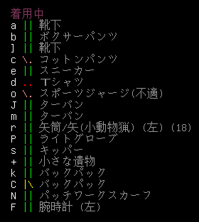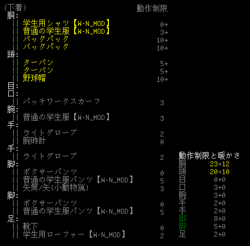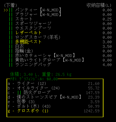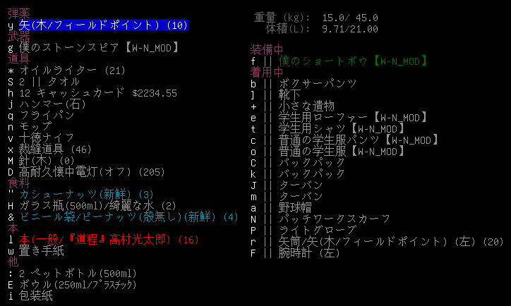 タロウ・タナカの装備は上の様になりました。悪くはないがトレンチコートに着替えたい。トレンチコートは収納が6.0Lもあるからね。
