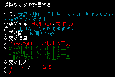 まあそのうち起きるだろう。暇だから燻製肉に必要な環境を考えます。燻製ラックの設置に必要な条件は上の画像です。料理スキルを2にするのは大変だと思う。フードプロセッサー等の調理器具が無いから厳しい。