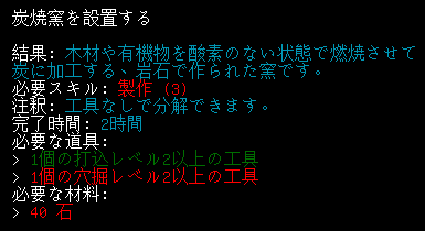 炭焼き窯の設置は簡単そうだぞ。条件の製作スキル3は余裕で達成できるだろう。穴掘りレベル2の工具をゲットするのは難しいかもね。