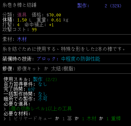 現在の製作スキルは2と低すぎます。スキル上げのために『糸巻き棒と紡錘』をクラフトしまくろう。製作時間は6分と短いし素材も木材1つと安い。