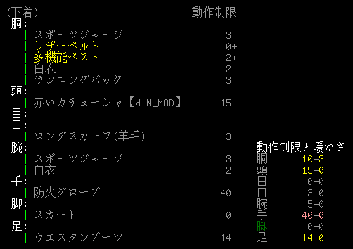 これでナオミちゃんの装備が完璧かと思いきや、そうではない。彼女は『手』の動作制限が40もあります。原因を調べたら防火グローブの動作制限が40だった。
