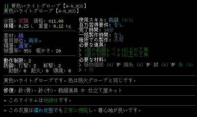ナオミちゃんにライトグローブを装備してもらおう。手袋の色を黄色から変えたくないので『黄色いライトグローブ』を用意しました。