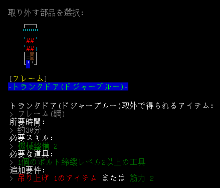 乗用車には上のようにトランクが取り付けてあります。162.50Lもの荷物を積載できるなんて羨ましい。『弓鋸(金工レベル2)』があれば取り外せるようだ。取り外した後は『フレーム(鋼)』というアイテムになります。