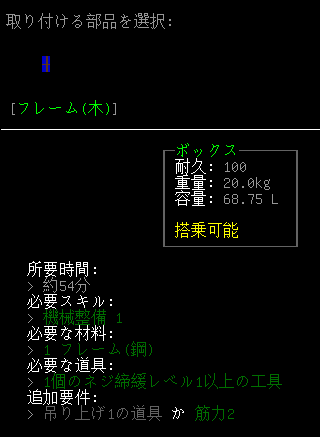 ショッピングカートはエンジンの付いていない自動車です。製作の際に表示するのはクラフト画面ではなく建設画面だ。建設は建設コマンド『*』を押すと実行できます。上の画像を見て分かるとおり最初に必要となる部品はフレームなのです。