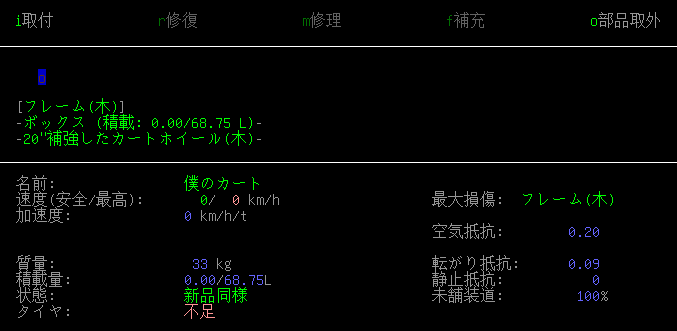 完成したカートの性能は上の画像です。タイヤが『不足』となっているのは無視しよう。アイテム回収だけでなく敵からの盾としても活躍してもらうぜ。