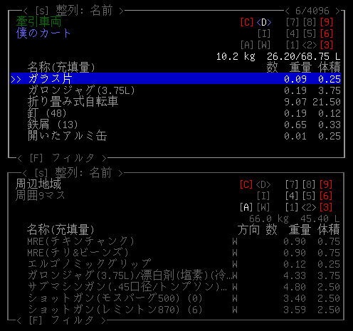 アイテム整理コマンドの説明なんて書くまでもないか。コマンド実行中に『D』を押すと掴んでいるカートが対象になります。『A』を押すと周囲9マスが対象になる。プレイヤーの周囲にあるアイテムを楽々とカゴに突っ込めるわけです。他にも便利なフィルタ機能があるので色々と試してください。