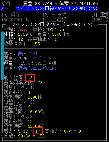 ライフル(.22口径/マーリン39A)の威力は17と低い。これでは豆鉄砲と馬鹿にされても仕方がないだろう。最大射程は13となかなかのものだ(ライフルとしては短すぎる)。威力を重視するのならばクロスボウ、連射力と射程が重要だとするのならマーリン39Aを選ぶことになる。