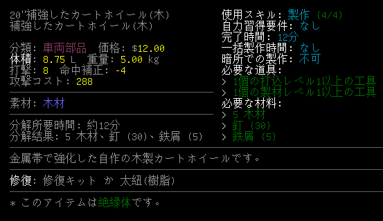 無意味とは思われるが木製のホイールを作りましょう。『20"補強したカートホイール』をクラフトします。これを取り付けても効果が無いっぽいんだよな。