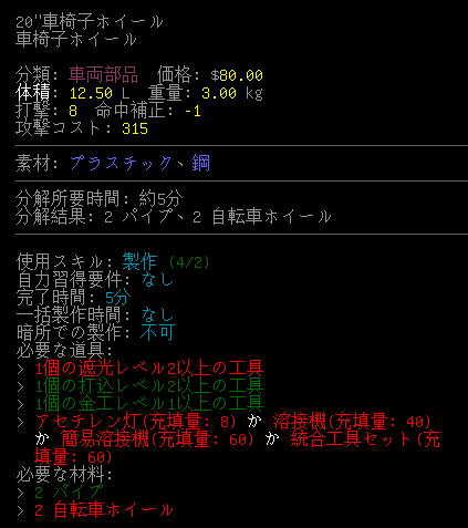 カート(1タイルの車両)のタイヤになるのは『4"キャスター』と上の『20"車椅子ホイール』です(たぶん)。4"キャスターは拾えなかったし、20"ホイールは工具がないから製作は不可能だ。