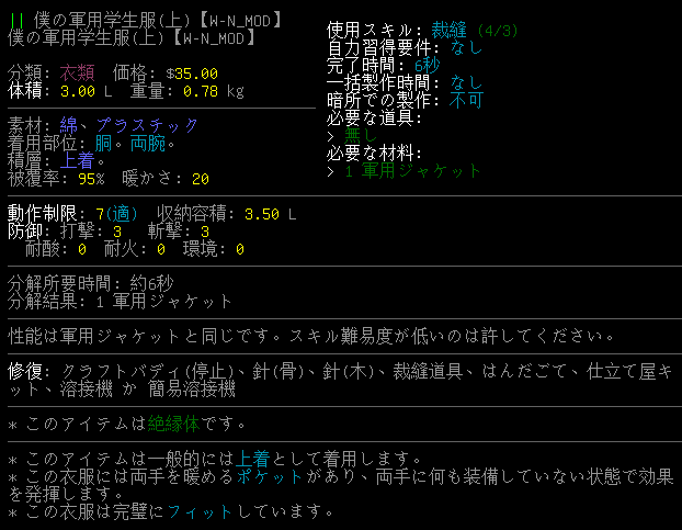 タロウ・タナカに超人工兵ゾンビの軍用ジャケットを装備させたい。軍用ジャケットを学生服に加工しちゃおう。クラフトにより軍用ジャケットのタイルを学生服に変えます。