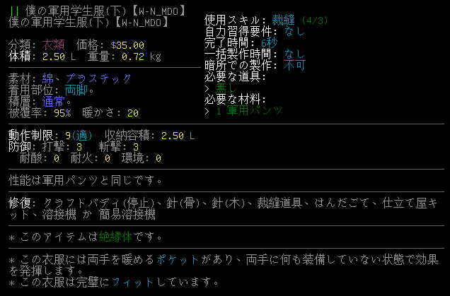 次は軍用パンツを学生服に加工します。軍用パンツの性能はコットンパンツに毛が生えた程度です。軍用なのに性能が低いから不思議だ。