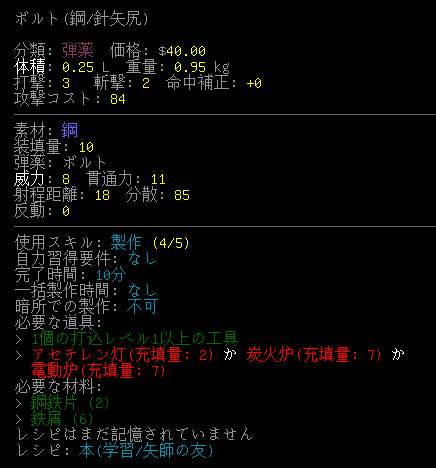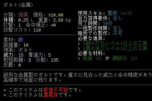 『ボルト(金属)』は射程3の性能があります。こいつを最大射程9のクロスボウに装填してみましょう。おそらく最大射程は『x=9+3』になるはずだ。