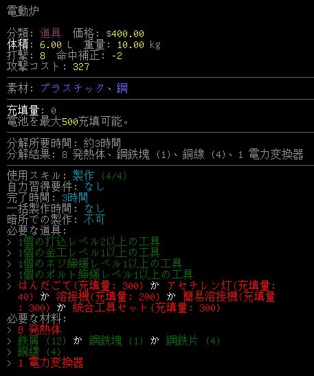 熱源は溶接機を確保すれば製作可能になります。例えば上の『電動炉』です。今のタロウ・タナカでは作れないけど・・・いや、作れるなあ?はんだごてがあるから今のタロウタナカでも製作できるぞ!作れないと勘違いをしたままプレイ日記を続けます。