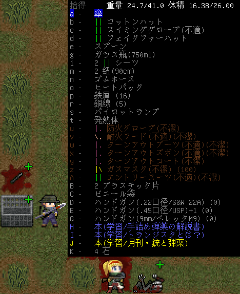 この時の所持品と装備品は上の画像です。学生服(元軍用ジャケット、パンツ)がお釈迦になっている。戦闘の際はカゴを手放せよ!恐ろしいことに次回もカゴを引っ張りながらゾンビと戦います。